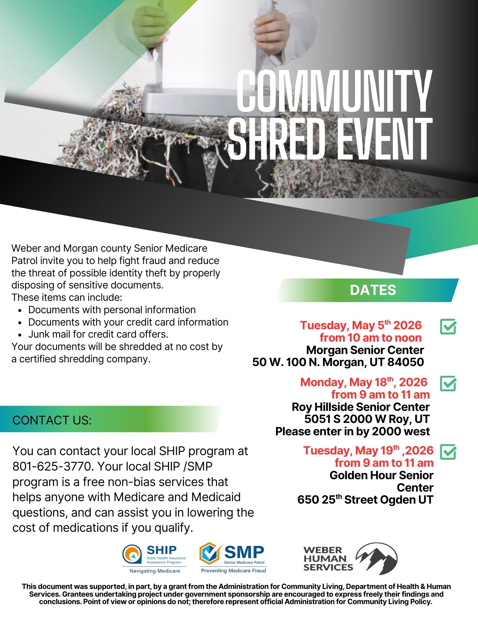 Community Shred Events in Morgan, Roy, and Ogden in May - Click here - Shred